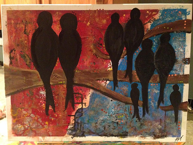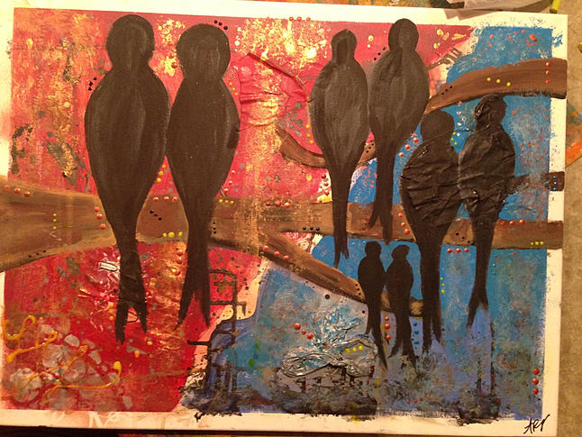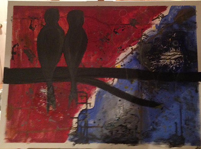I started this painting in a group session layering words, text, and paint with drips and splatters along with a larger shape over the whole background. I chose love birds. A rather random process for sure.