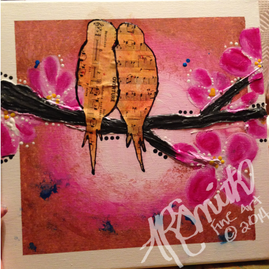 really enjoyed the musical love birds I put in to my cherry blossom painting last weekend, so I decided I wanted to do a series of paper/text-based love bird paintings ….I thought it would be fun to explore texture and various texts to make the love birds.