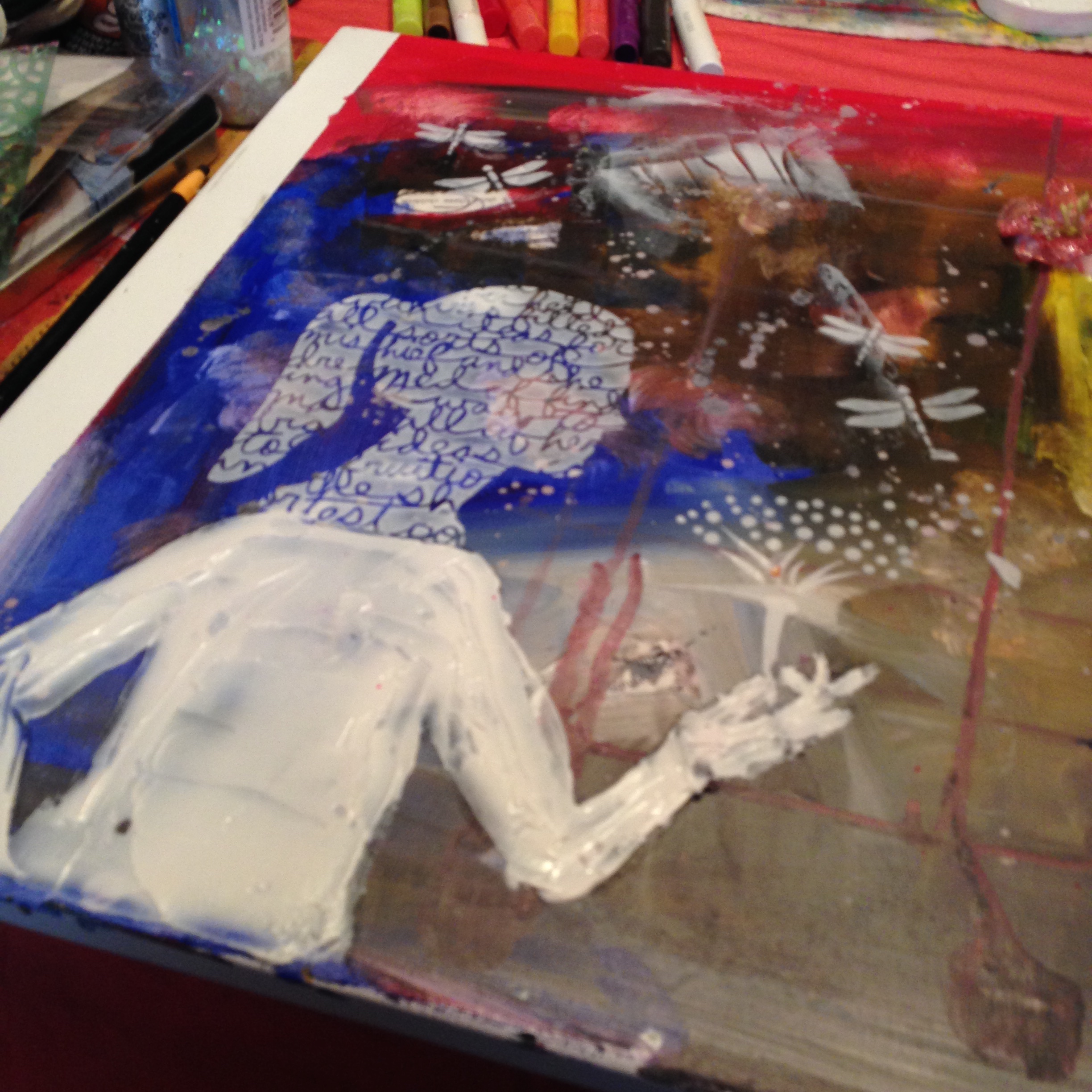 I started a piece at a Reflective Art Activity hosted by a workplace. The background was made by layering crayon, ripped book text, and acrylic paint – drips & splatters.