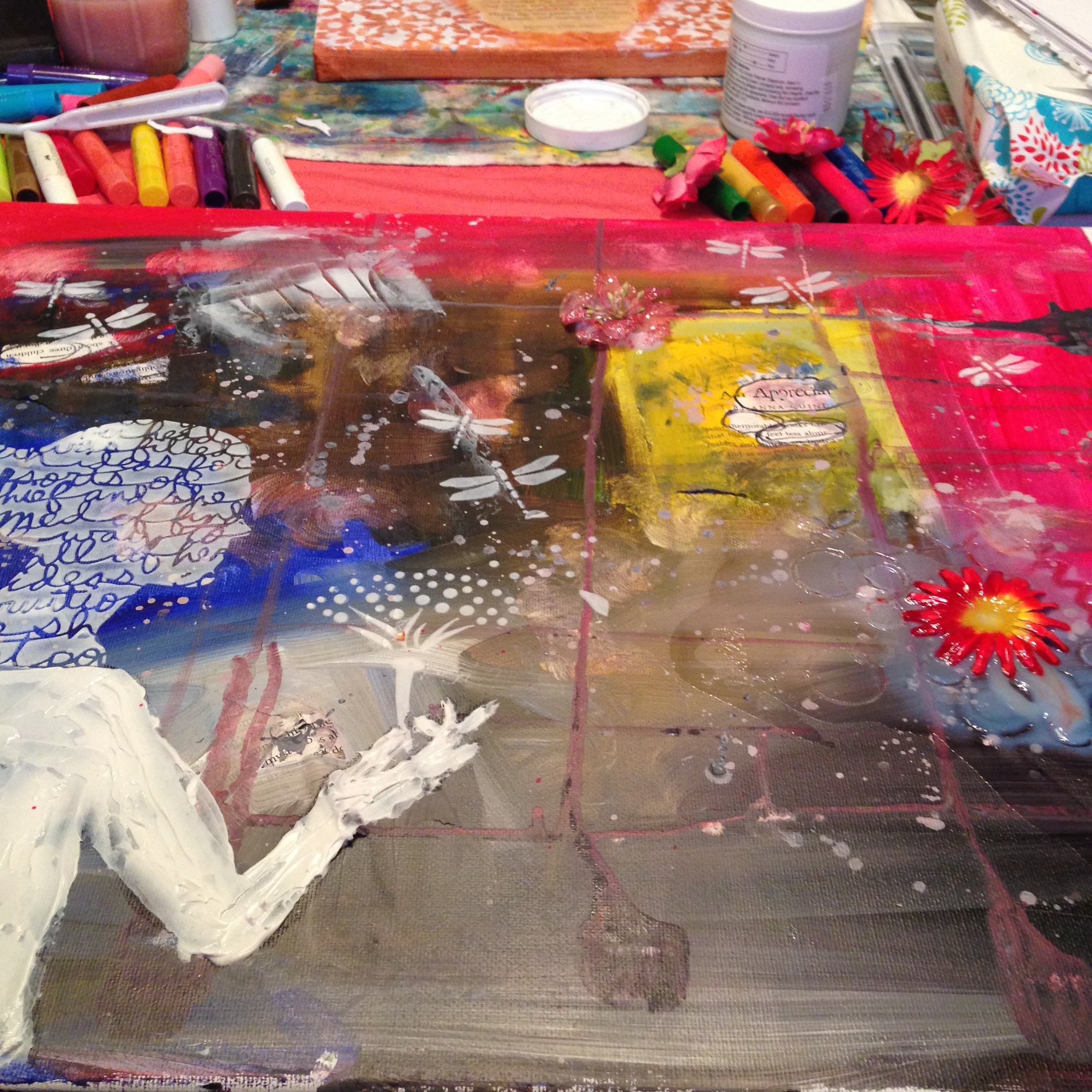 I still felt like the picture was too busy and I couldn’t focus my eyes on the girl with the flower, so I did a magenta glaze drip over the top. The texture still shows through but the color unifies the top portion and draws the eye to the girl instead.